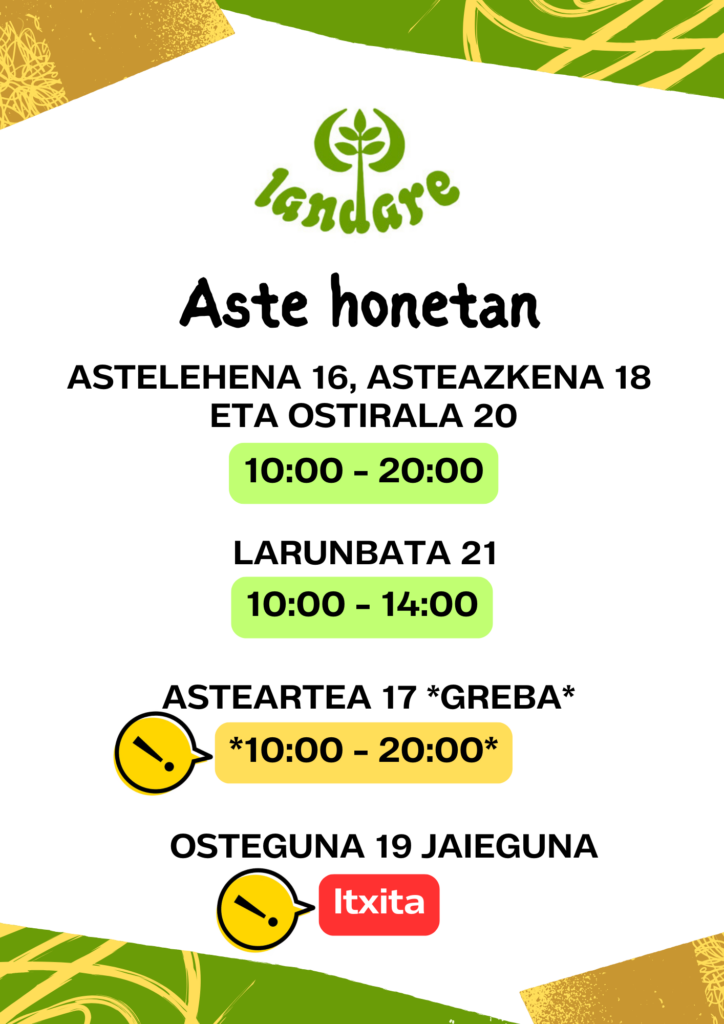Normala den bezala, jai egun baten aurreko asteazkena izanik, dendak 10:00etatik 20:00etara irekirik egonen dira eguerditan itxi gabe.